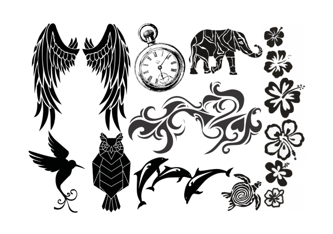 Unsere Tattoo-Bögen sind 20 × 14 cm groß und mit den Tattoos gefüllt, die Sie im Produktbild sehen.